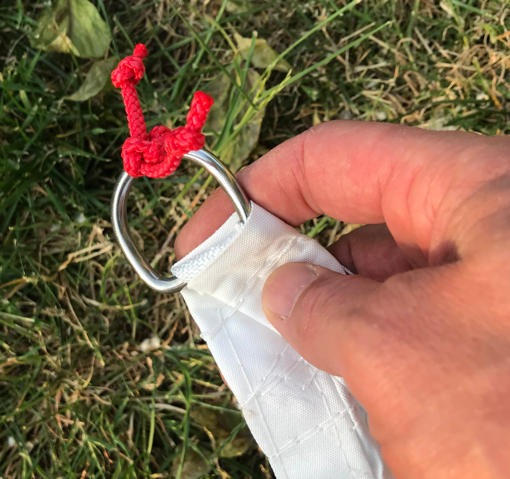Maak de karabijnhaken van de rode touwen wast aan de hoek van de tarp waar het rode touwtje aan zit.