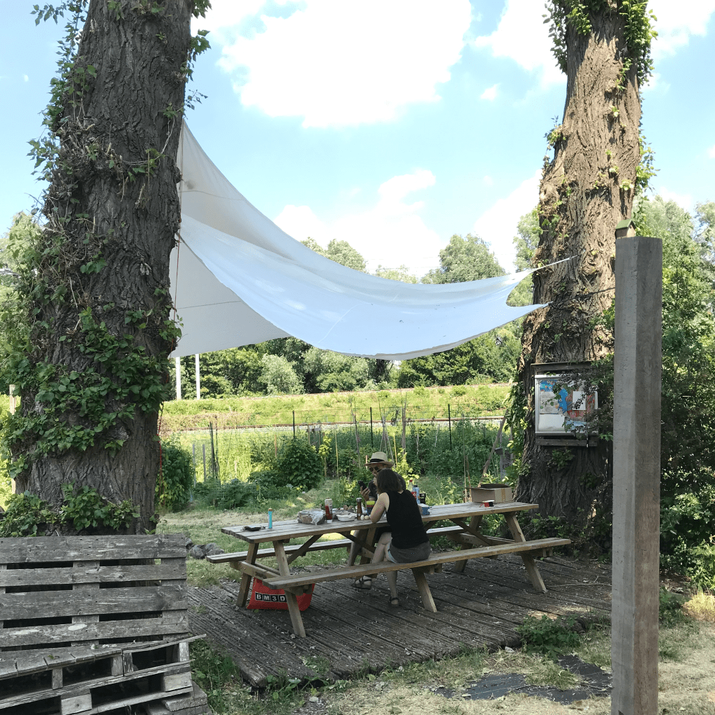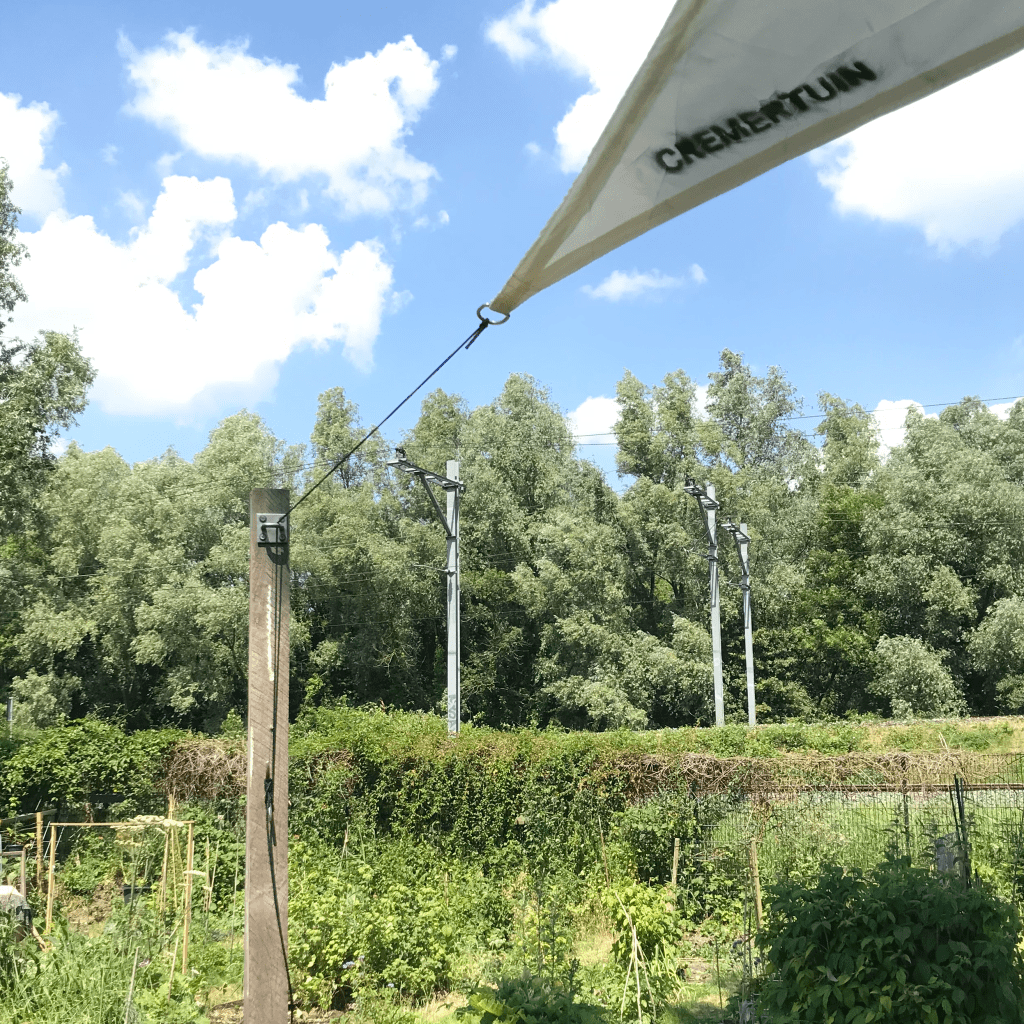 Tussen de bomen bij de vlonder kan je twee tarpen (tarps?) ofwel (schaduw) doeken ophangen. Zo heb je schaduw als de zon schijnt, of zit je droog als het regent.